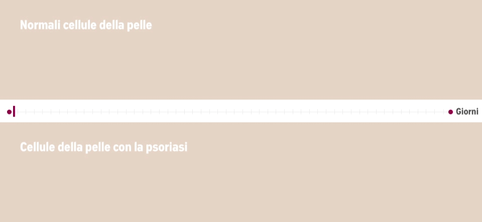 La psoriasi è una patologia comunemente associata ad una crescita troppo rapida delle cellule cutanee. Segnali errati, che hanno origine nel , fanno sì che le nuove cellule della pelle si formino nel giro di giorni, anzichè di settimane. L’eccessiva crescita di queste cellule cutanee provoca le tipiche lesioni della psoriasi. Queste hanno tre caratteristiche: squamosità, ispessimento ed (rossore).E’ importante sottolineare che la crescita cellulare accelerata non ha nulla a che vedere con il cancro.La psoriasi è vissuta in maniera diversa da persona a persona. Alcuni avvertiranno solo sintomi leggeri, quali lievi ed occasionali chiazze e , mentre altri manifesteranno sintomi fisici più gravi.
